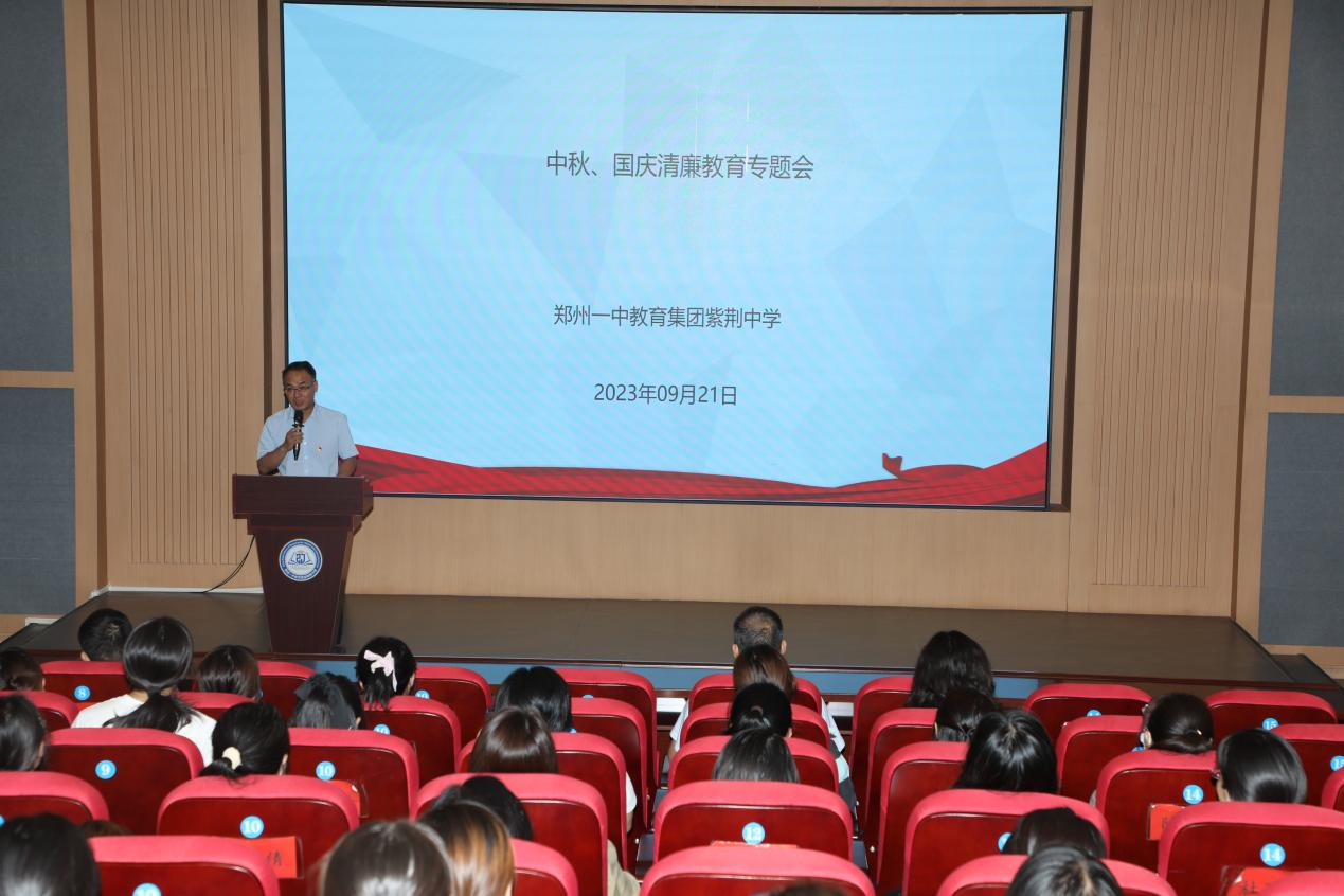 9月21日下午,郑州市管城回族区紫荆中学召开中秋、国庆节清廉教育专题会暨安全工作会议,中层以上领导干部及全体教职工参加会议。会议由副校长梁爱学主持。
