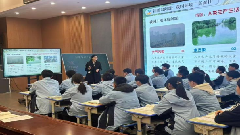 随后,紫荆中学两位教师针对新教材中的重点新增内容进行了教学展示。赵晓娜老师以《中国的环境保护与发展》为题,以“读图识问题—探因找措施—理念升华—实践迁移”为清晰脉络,通过严谨的数据和生动的案例,层层深入地引导学生分析了我国面临的环境挑战,领略了从国家生态工程到地方治理的“中国智慧”,并将生态文明理念落脚于身边的“贾鲁河畔项目”,激发学生学以致用的责任感。