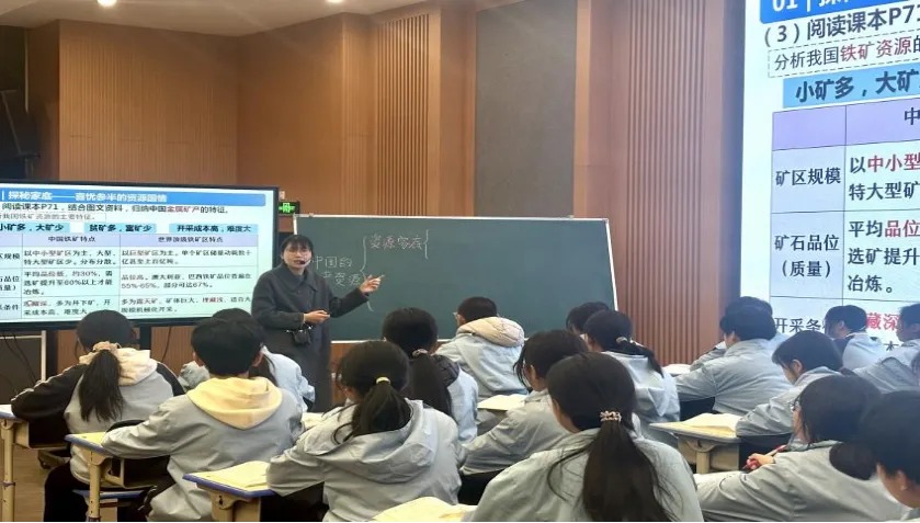 李佳惠老师则带来了《中国的矿产资源》一课,以“探秘家底—把脉现状—共创未来”为主线,从教室物品巧引课题,通过丰富的地图与资料,引导学生辩证认识我国矿产资源的特征与困境,并围绕战略性矿产安全、资源型城市转型等现实议题展开探究,培养学生的忧患意识与解决实际问题的能力。